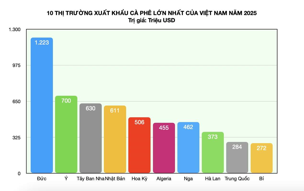 10 thị trường xuất khẩu cà phê lớn nhất của Việt Nam năm 2025