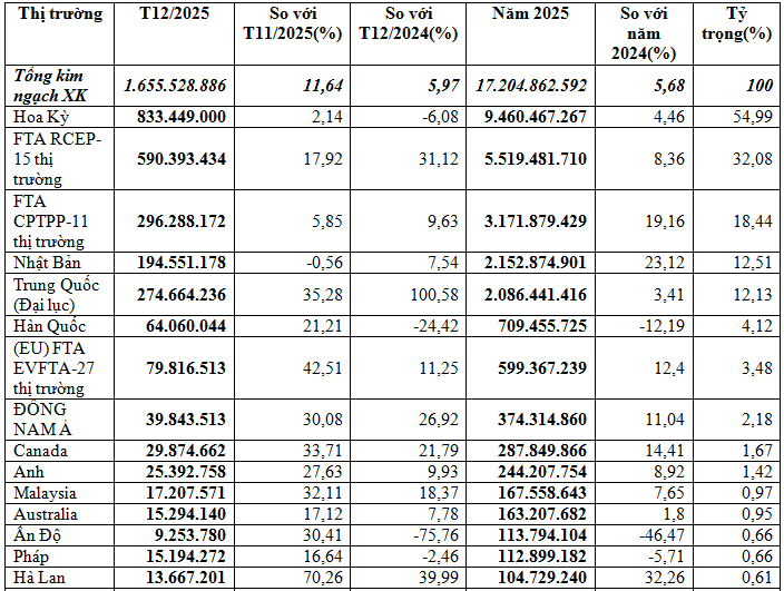 Tính chung năm 2025 xuất khẩu nhóm hàng này đạt trên 17,2 tỷ USD, tăng 5,8% so với năm 2024.