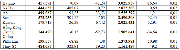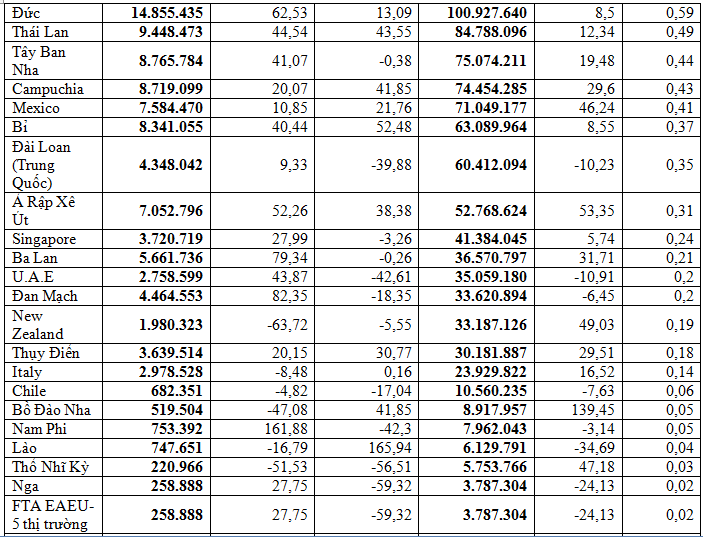 Bên cạnh đó là một số thị trường cũng đạt kim ngạch cao như: Nhật Bản đạt 2,15 tỷ USD, chiếm 12,5%, tăng 23,1%; Trung Quốc đạt 2,09 tỷ USD, chiếm 12,1%, tăng 3,4%; Hàn Quốc 709,46 triệu USD, chiếm 4,1%, giảm 12,2%. Xuất khẩu gỗ và sản phẩm gỗ sang thị trường Canada đạt 287,85 triệu USD, chiếm 1,7%, tăng 14,4%; Xuất khẩu sang thị trường Anh đạt 244,21 triệu USD, chiếm 1,4%, tăng 8,9%.