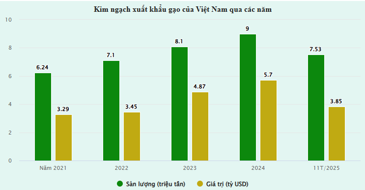 Theo số liệu thống kê sơ bộ của cơ quan Hải quan, trong 11 tháng đầu năm 2025, xuất khẩu gạo đạt hơn 7,53 triệu tấn gạo với trị giá…